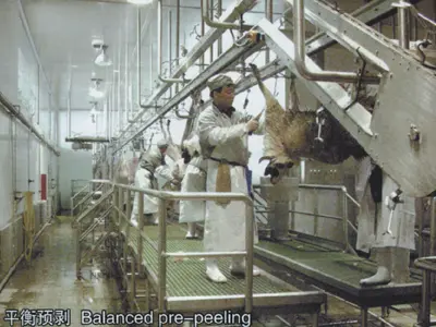 放血的预剥自动输送线的钩子勾住了羊的后腿,扯皮自动输线的钩子勾住了羊的两前腿,两条自动线速度同步进行,羊腹朝上,背向下,平衡地向前移动,在输送时进行预剥。该预剥方法可以有效地控制毛皮在预剥过程中的粘连。